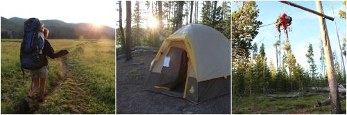 Am Abend dann wird's aufregend: Wir haben uns mal wieder Wilderness-Permits geholt. Diesmal mussten wir vorbereitend ein Info-Video ansehen, dass vor allen Gefahren des Wildcampens warnt, und außerdem mussten wir ein Seil kaufen. Nach dem Abendessen (die letzte Packung-Nudeln ist angebrochen!!) marschieren wir los zum Ice-Lake. Alles Essen und Zahnpasta haben wir vorsorglich beim Auto gelassen - wir wollen ja keine Bären anlocken. Irgendwann kommen wir bei Camp 4D2 an - seltsam, wir müssen zu Camp 4D1, hätten wir da nicht schon vorbeikommen müssen? Also wieder ein Stück zurück in der immer tiefer sinkenden Sonne und da ist es auch - eigentlich nicht zu übersehen - das Schild zu unserem Zeltplatz. Typisch! Jetzt geht es erst richtig los und das brandneue Seil kommt zum Einsatz: Um Bären von den Rucksäcken fernzuhalten, muss man diese mit dem Seil über einen Holzbalken hängen. Gar keine so leichte Aufgabe, auch wenn uns Hannas Klettererfahrung knotentechnisch zugute kommt (Julians Knoten-App kam leider nicht zum Einsatz, da unsere Handy-Akkus jämmerlich leer waren. Schade, hier wäre uns die zu Anfang der Reise von uns belächelte (Über)Vorsicht endlich doch mal zugute gekommen.) Nach erfolgreich gemeisterter Challenge wollen wir eigentlich noch etwas diesen einzigartigen Campingplatz genießen, den wir in vollkommener Wildnis so ganz für uns alleine haben, doch die Monstermoskitos treiben uns bald ins Zelt. Hier schlafen wir auch bald im letzten Tageslicht um 9:30 Uhr ein.