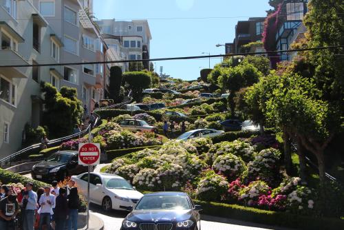 ... und durch den Financial District zum Telegraph Hill - eine tolle Sicht über die Hügel der californischen Stadt. Dort bekommen wir die Auswirkungen des frühen Aufstehens zu spüren und legen eine kurze Mittagspause ein. Auf dem Weg Richtung Ufer finden wir - der knurrende Magen dankt es - ein Straßenfest. Eine Stunde lang lassen wir uns durch die mit unwiderstehlichen Leckerbissen und Live-Musik gespickten Gassen treiben. Dann geht's weiter zur Lombard Street, der weltbekannten Schlaengelstrasse.