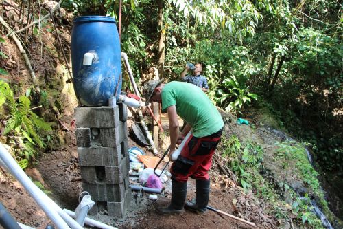 Eine Woche haben wir mitten im Urwald gelebt. Geplant waren allerdings zwei Wochen und eigentlich sind wir auch mit dem festen Vorsatz in den Corredor gefahren, dort zwei Wochen zu verbringen und die Schuhgröße unseres ökologischen Fußes durch das Pflanzen einiger Bäume wenigstens etwas zu verringern. Bereits am ersten Arbeitstag jedoch werden wir statt mit Spaten und jungen Bäumen mit Sägen und nach Blausaeure stinkendem toxischen Kleber ausgestattet und müssen einen Vormittag lang Plastikrohre zurechtschneiden. Gut, eine Ausnahme, denken wir optimistisch und finden es noch recht interessant, wie Miguel, der Projektleiter, Wasserfilter gestaltet ("Ah sisters, you always have to design something" - mit sisters waren immer wir gemeint). Am nächsten Tag jedoch, geht es in aller Früh den Berg hinauf zu einer wunderschönen Urwaldquelle, die bereits durch einige Rohre und eine Plastiktonne verschandelt ist. Den Vormittag verbringen wir dann damit, dort weitere Plastikrohre zu installieren, entdecken dabei Rohre, die ins Niemandsland fuehren, deren Funktion uns keiner erklaeren kann. Und am folgenden Tag - man wird es kaum erahnen - geht es noch ein weiteres Mal zur Quelle. Abschlussarbeiten. Den Standpunkt der neuen Tonne festbetonieren, ein erhitztes Metallrohr mit Antirostfarbe besprühen, und weitere Plastikrohre verlegen.