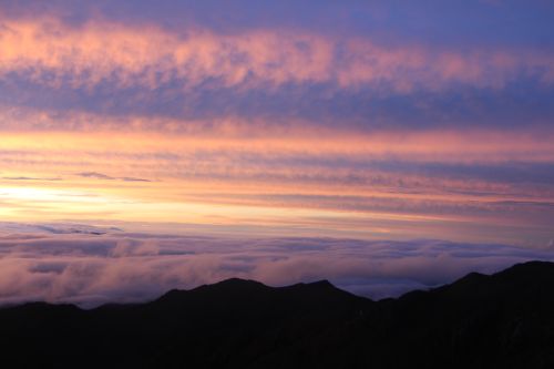 Wir stehen auf 3820 Metern Hoehe, unter uns ein Meer aus im Licht der aufgehenden Sonne getraenkten Wolken. Die Welt so unberuehrt und fast schon surreal.